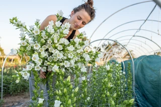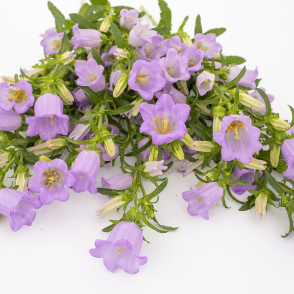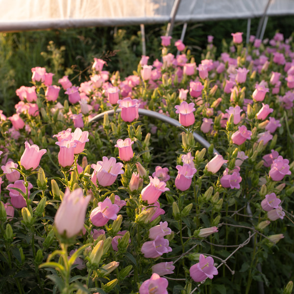 Klokjesbloemen zijn op onze boerderij een geweldige oogst! We oogsten twee rondes per seizoen en ze zijn meteen uitverkocht. Ze geven een prachtig weide-effect. Eén plant produceert één sterke, vertakkende centrale steel met veel klokjes; na het knippen kun je nog een paar dunne stelen met één klokje oogsten. Champion Lavender is een zachte paarse tint die zo typisch is voor klokjesbloemen.